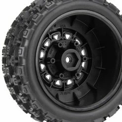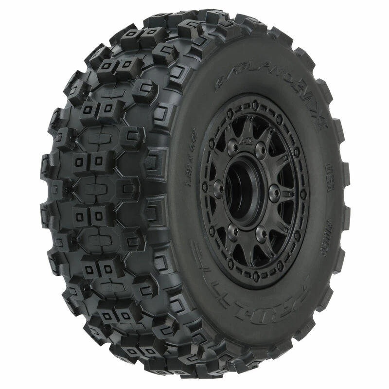 This is a pair of pre-mounted Badlands MX SC Tires on Raid Black 6×30 Removable Hex Wheels. Are you ready for the most Extreme Badlands Short Course Tires Pro-Line has ever made? Introducing the all-new Badlands MX SC tires that have been redesigned from the ground up to chew up the dirt and spit it out in a huge spray behind your SC truck!