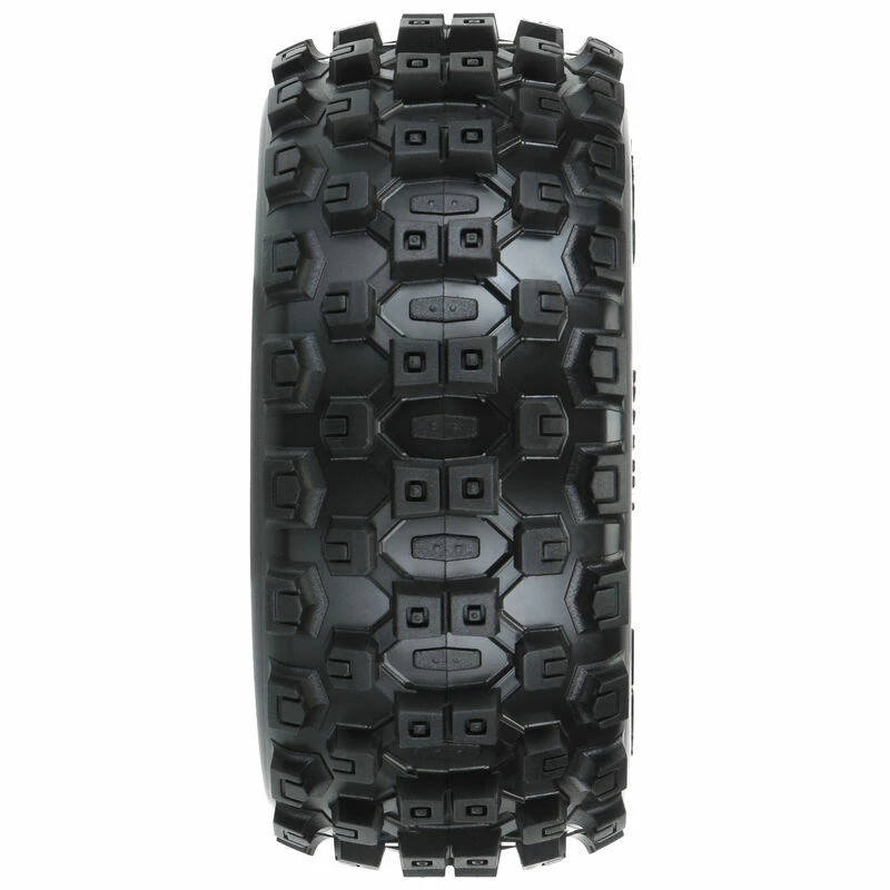 The Badlands MX SC tire uses the latest in motocross tread technology with huge, long-lasting lugs giving it the style and performance that have won over bashers across the globe. The oversized grass and dirt shredding lugs offer you the ultimate in performance under all-terrain type conditions. Compared to the previous Pro-Line Badlands tires, you can expect even better traction, improved wear resistance, and enhanced style! Made from Pro-Line’s legendary soft yet durable M2 compound, the Badlands tire is poised for battle and ready to take your Short Course Truck to the next level of bashing heaven.