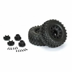 This is a pair of pre-mounted Badlands MX28 HP 2.8″ Belted Monster Truck Tires. Pro-Line is taking the 2.8″ tire game to the next level with the Baddest tire ever conceived: the Badlands MX28 HP BELTED tires! Pro-Line Badlands tires are known for having a sweet Motocross inspired tread and the Badlands MX28 HP tires kick that up a notch with Bigger and Bolder knobby tread in a similar size to the Original Badlands 2.8″ tire that you know and love. The Badlands MX28 is a true All-Terrain tire that will find traction on any surface but is best suited for loose & loamy dirt, mud or grass. Just imagine your truck throwing up huge rooster tails with these awesome looking tires!