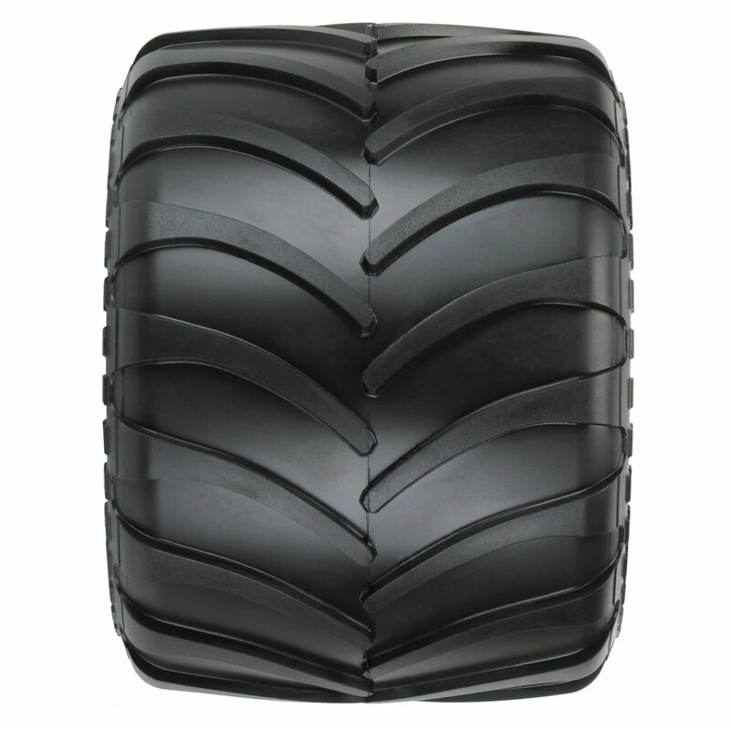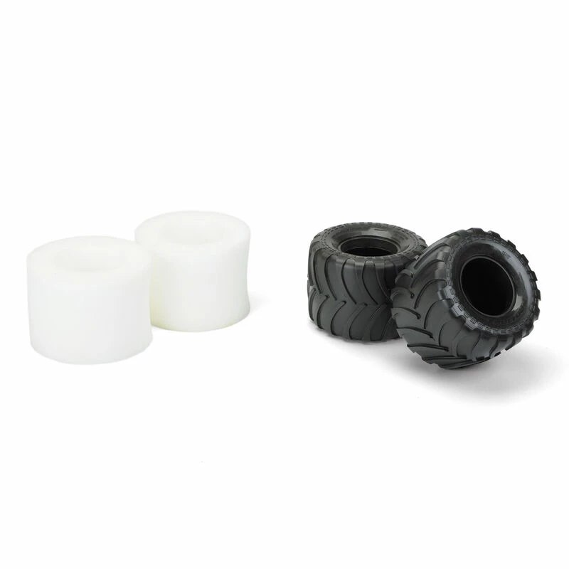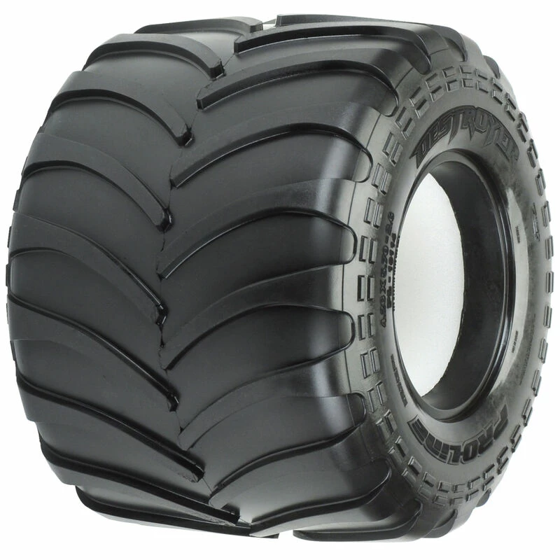 This is a Destroyer 2.6″ Solid Axle Monster Tire. Pro-Line is proud to introduce an tire specifically designed for Scale Solid Axle Monster Trucks: the Destroyer!! The Destroyer is made from Pro-Line’s Legendary M3 Race Rubber for Maximum Destructive Traction on Dirt or Carpet. Similar to full-size Monster Truck Tires the Destroyer features an alternating deep-grooved chevron style tread pattern for incredible forward traction while maintaining a scale appearance. The overall size and width of the Destroyer tires have been finely tuned to be lightweight and agile, which makes it ideal for racing applications. The Destroyer includes soft white foam inserts for ultra-plush landings, greatly improving the handling and performance of your Solid Axle Monster Truck. The Destroyer is Destined to become the Go-To Tire for Solid Axle Monster Trucks! Get yours Today!!