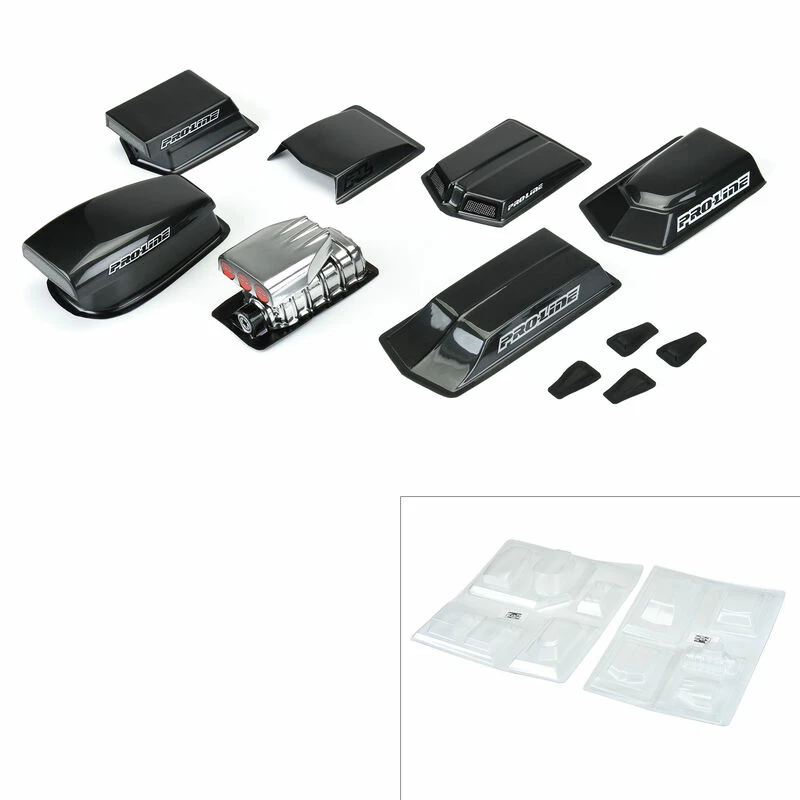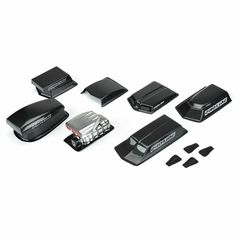 This is a pack of Optional Drag Racing Hood Scoops and Blowers. Do you want to customize the look of your Drag car with next-level detail that will blow your friends away? Look no further than Pro-Line’s new variety pack of optional clear polycarbonate scale accessories that can be painted and customized to perfectly match your car! The pack includes a two-piece scale intake and blower that will transform your car into full-on American Muscle. The included Pro Stock and Pro Mod style hood scoops and cowls are perfect for recreating a more serious drag racer look. Pro-Line even includes scale Naca ducts that can be placed in the windows or anywhere you want for an incredibly unique and ultra-scale appearance. These scale accessories are perfect for many of Pro-Line’s popular Drag bodies but can be made to fit almost any 1:10 or 1:8 scale bodies. Get your own variety pack of Optional Hood Scoops and Blowers today!