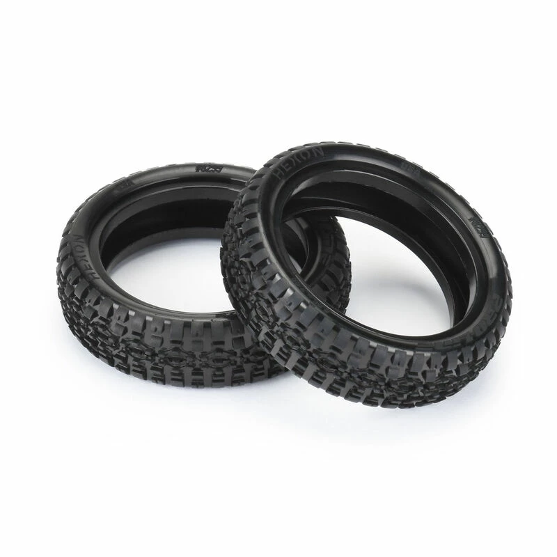 This is a pair of Hexon 2.2″ 2WD Front Carpet Buggy Tires. Introducing the Pro-Line Hexon 2.2″ Carpet 2WD Front race tire! The Hexon front tire features a hexagon pattern of uniquely shaped pins combined with Wedge style outer pins that provide longer-lasting tread and more consistent performance than previous generations of carpet tires. The Hexon front features a low-profile tire carcass shape that lowers your car’s center of gravity for improved corner speed due to consistent sidewall flex. The Hexon pins are pointed front to back for maximum control in the corners providing the direct feel carpet racers crave. The Hexon front tire is another leap forward in the hot carpet racing scene; be the first with the fastest carpet tire yet – Pro-Line’s Hexon Front!