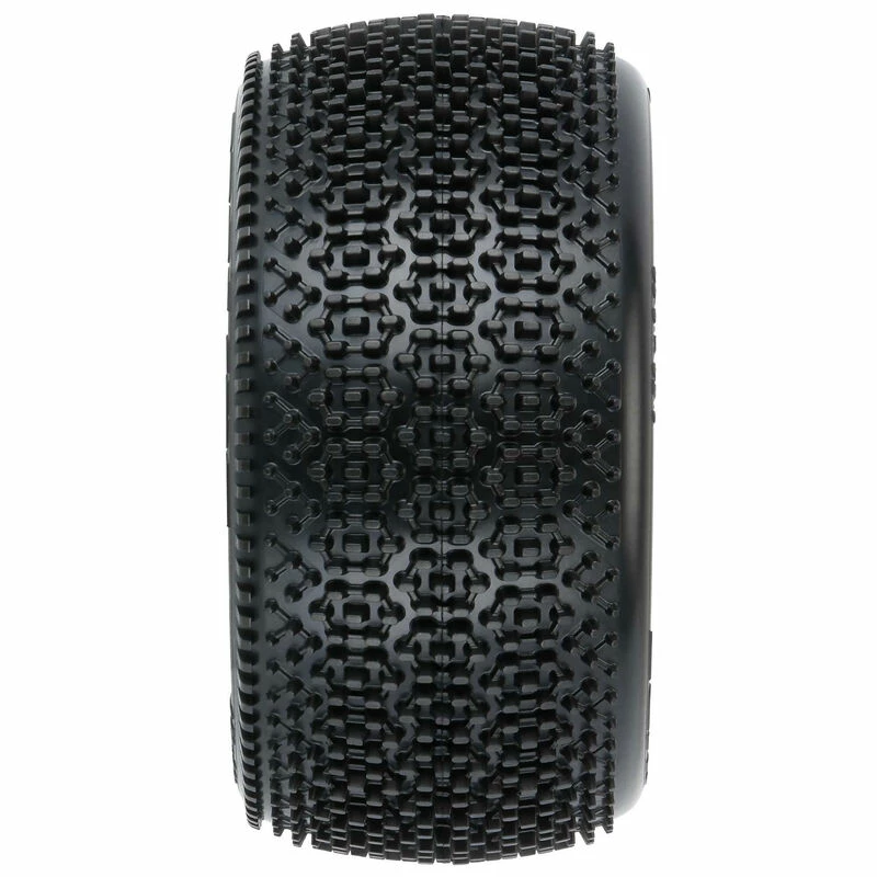 This is a pair of Hexon Buggy Rear Carpet Tires. Introducing the Hexon Carpet Buggy Rear race tire! The Hexon features a hexagon pattern of uniquely shaped pins that provide longer-lasting tread and more consistent performance than previous generation carpet tires. Just like the Prism 2.0, the Hexon features a low profile tire carcass shape that lowers your car’s center of gravity for improved corner speed. The Hexon pins are positioned with the flat edge pointed front to back for maximum forward grip and are narrow when viewed from the side to reduce traction rolling. This new tire also features a directional side tread so you can tune the performance of your tires to the current track conditions. You can choose to mount the standard pins on the outside for a more aggressive grip, or you can mount the vertical side pins to the outside for a more forgiving grip. The Hexon tire is another leap forward in the hot carpet racing scene; be the first with the fastest carpet tire yet – Pro-Line’s Hexon!