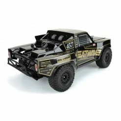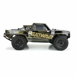 This is a 1967 Ford® F-100 Race Truck Heatwave® Edition Black Body for Short Course. Now you can build a fully licensed replica of the popular full-size Heatwave® Trophy Truck driven by Chris Isenhouer! Chris races his iconic Black and Gold Heatwave® Ford® F-100 converted to Trophy Truck specs in the unrelenting desert along with his brother Nick. Pro-Line is proud to bring Chris’s truck to life for your Short Course Truck made from Tough-Color Black Polycarbonate! The Black and Gold Heatwave® decal wrap is also included and pre-cut for easy installation. The body features the iconic flat front F-100 grill and wide fender flares to represent the aggressive fiberglass bulges found on Chris’s full-size race truck. The Pre-Cut Tough-Color Black material will never peel or chip off and realistic window stickers are also included! Here is all you need to do to get up and running: remove the outer film, place the wrap following the included Instructions, and mount the body. Transform the look of your Short Course Truck and add even more scale realism with the fully licensed 1967 Ford® F-100 Race Truck Heatwave® Edition Body from Pro-Line!