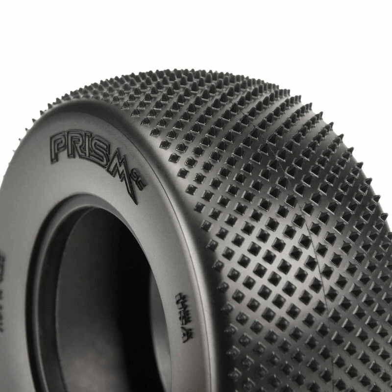 This is a pair of Prism SC Rear Tires. Pro-Line is ready to bring the popular Prism tread pattern to the Short Course class! The Prism features a bunch of Ultra-Sharp Prism shaped Pins laid out in a unique pattern that grip the carpet better than Velcro®. The pins on the Prism are slightly smaller than the original Pin Point rear tire but there are many more of them, which results in faster and more consistent lap times. The Prism has been positioned with the knife edge pointed front to back and side to side for maximum grip and to stay sharp even as they wear down. The Prism tire is destined to change the carpet racing scene; be the first one with the fastest carpet tire yet – Pro-Line’s Prism!