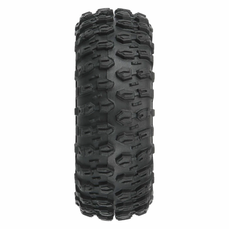 The future of SCX24™ Tire Performance has arrived with Pro-Line’s all-new pre-mounted Hyrax 1.0″ Tires! Just like Pro-Line’s 1:10 size Hyrax tires, these mini tires are designed to provide maximum grip on whatever terrain your SCX24™ attempts to tackle. The Hyrax features an aggressive and open tread pattern with each tread block containing Sipes for additional tread flex. The highly detailed connected tread on the sidewall of the Hyrax extends out for unmatched side-hilling performance. The Hyrax also features futuristic stepped tread blocks that create even more forward gripping edges that dig into slick rock like no other mini tire produced to date! The Hyrax 1.0″ tires are made from a super soft compound to help your SCX24™ climb to new heights and the tires are supported with soft foam inserts. The Hyrax 1.0″ tires come in at an overall height of 2.10″ and a width of 0.75″.