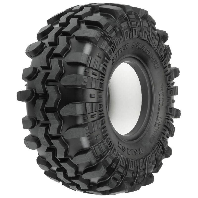 This is a pair of Interco® Super Swamper® TSL SX 2.9″ Crawler Tires. Under official license from Interco® Tire Corporation, Pro-Line is proud to announce the gnarliest tire yet for the 1/6 SCX6™ rock crawler: the legendary Super Swamper® TSL SX! With “almost scale” not being acceptable and access to Interco’s® design data, Pro-Line’s engineering staff has reproduced the original Super Swamper® in a scale configuration matched by none. At a massive 7.15″ tall by 3″ wide, the Swamper® adds a whole new style to your rig, perfectly combining scale looks with the legendary G8 compound for unmatched rock crawling performance.