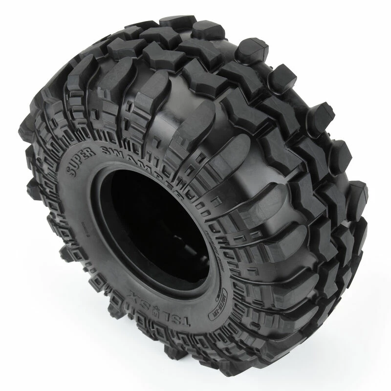 The full-size Super Swamper® TSL SX features the ultimate tire tread design by pairing the distinctive chevron tread pattern with the famous, trademarked, and patented Interco® TSL (three-stage lug) tread design. TSL is a lug pattern with short, intermediate, and long lugs that are each uniquely arranged, proportioned, and spaced which allows them to bite quickly and self-clean rapidly. Each of these details has been faithfully recreated in 1/6 scale to fit the 2.9″ SCX6™ wheel. For the ultimate upgrade, pair them with the Dual Stage Foams (PRO637600) Just like the full-size Interco® Super Swamper® TSL SX tires, Pro-Line tires are proudly Made in the USA!