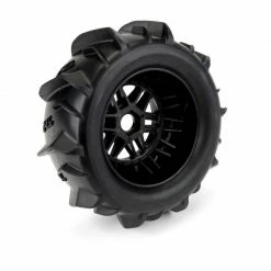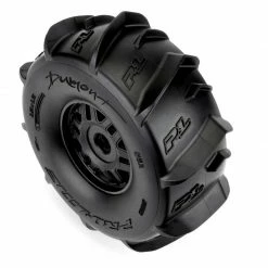 The Dumont Paddle tire uses the latest in paddle tread technology with large offset V-shaped paddles for maximum roosting power. Pro-Line P-L logos have been embedded into the tire carcass giving it the style that you have come to expect from Pro-Line. The Dumont Paddle tire gets its name from the incredible Dumont Sand Dunes in California, but these paddle tires are equally at home shredding your local snowfield in the winter. The Dumont Paddle tires are mounted to a pair of stock “Split Six” style Black ARRMA® Mojave™ wheels so you know they will fit and perform exceptionally well. We take the guesswork out of your glue job by doing the mounting for you so you can spend your time having fun! Don’t get stuck spinning your tires in the sand or snow. Get a set of pre-mounted Dumont Paddle tires for your ARRMA® Mojave™ today!