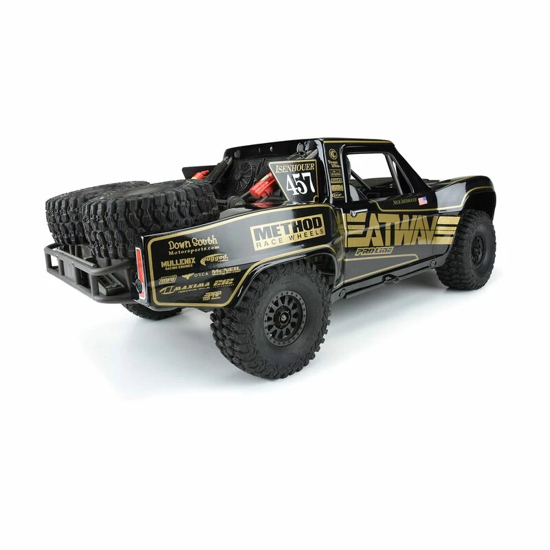This is a 1967 Ford® F-100 Race Truck Heatwave® Edition Tough-Color (Black) Body for the Unlimited Desert Racer®. Now you can build a fully licensed replica of the popular full-size Heatwave® Trophy Truck driven by Chris Isenhouer! Chris races his iconic Black and Gold Heatwave® Ford® F-100 converted to Trophy Truck specs in the unrelenting desert along with his brother Nick. Pro-Line is proud to bring Chris’ truck to life for your Traxxas® UDR® made from Pre-Cut Tough-Color Black Polycarbonate. The massive Black and Gold Heatwave® decal wrap is also included and pre-cut for easy installation. The body features the iconic flat front F-100 grill and wide fender flares to represent the aggressive fiberglass bulges found on Chris’s full-size race truck. Pro-Line’s 1967 F-100 Heatwave® Edition body mounts directly to the cage on the UDR® in the same locations as the stock body, so all you need to do is remove the outer film, place the wrap following the included instructions, and install the body just like you would the stock body. Transform the look of your Unlimited Desert Racer® and add even more scale realism with the fully licensed 1967 Ford® F-100 Race Truck Heatwave® Edition Body from Pro-Line!