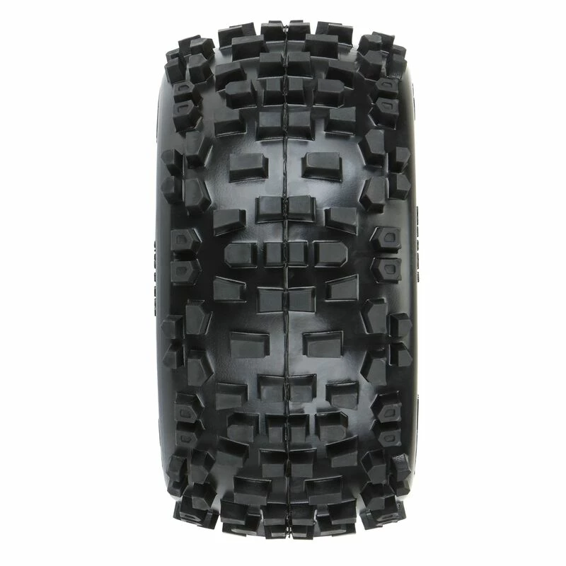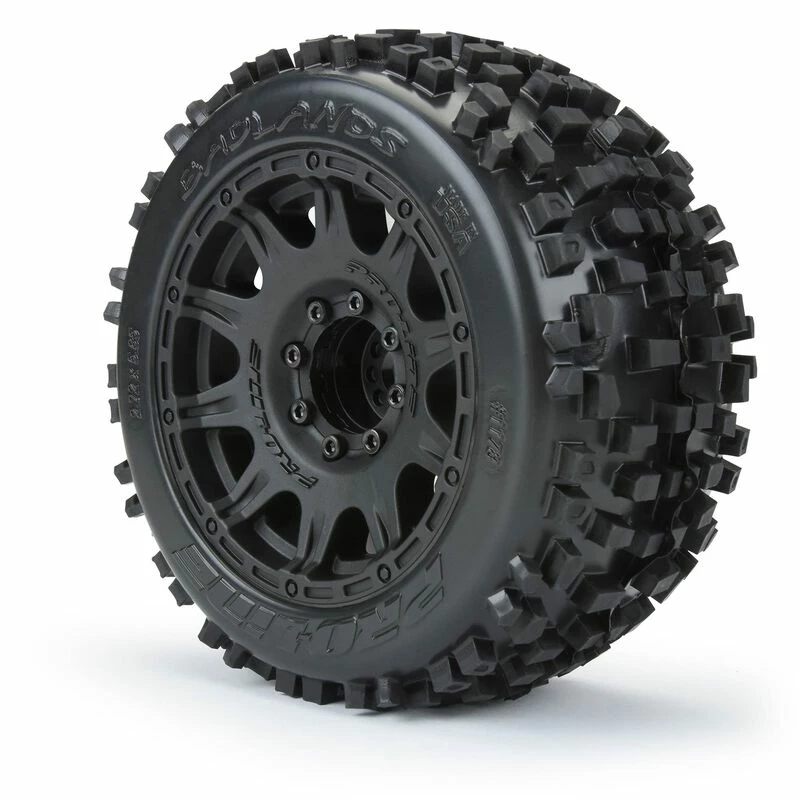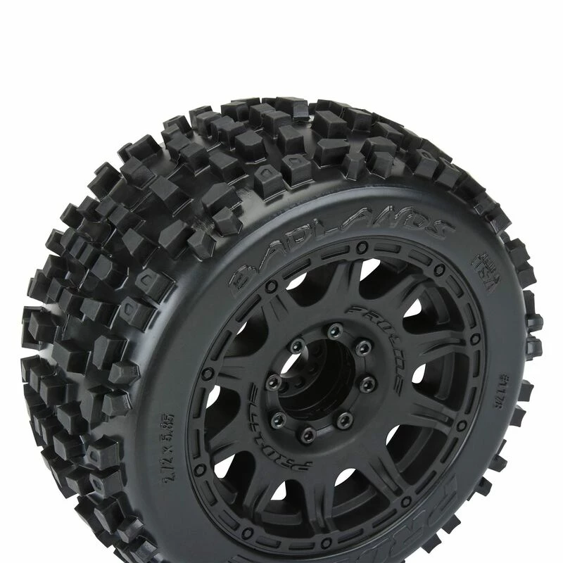 The Badlands 3.8″ tires now come Pre-Mounted on the next generation 3.8″ wheel design from Pro-Line, the Raid 3.8″ Removable Hex Wheel! Imagine being able to replace a damaged wheel hex without needing to replace your glued tires! These Raid 3.8″ wheels make this possible by using a unique 8×32 interlocking hex design that is secured to the wheel by 8 M3 screws that are spaced 32mm across. The hexes are included and are also available separately (PRO634500). The built-in adjustability and ease of use make this a must-have wheel for bashers everywhere! Be the first to own the latest and greatest technology from Pro-Line, get the pre-mounted Badlands 3.8″ tires now!