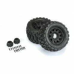 The Badlands MX38 tires come Pre-Mounted on the next generation 3.8″ wheel design from Pro-Line, the Raid 3.8″ Removable Hex Wheel! Imagine being able to replace a damaged wheel hex without needing to replace your glued tires! These Raid 3.8″ wheels make this possible by using a unique 8×32 interlocking hex design that is secured to the wheel by 8 M3 screws that are spaced 32mm across. The hexes are included and are also available separately (PRO6345-00). The built-in adjustability and ease of use make this a must-have wheel for bashers everywhere! Be the first to own the latest and greatest technology from Pro-Line, get the pre-mounted Badlands MX38 tires now!
