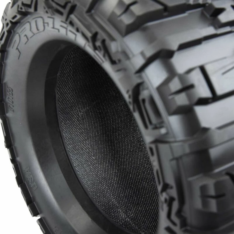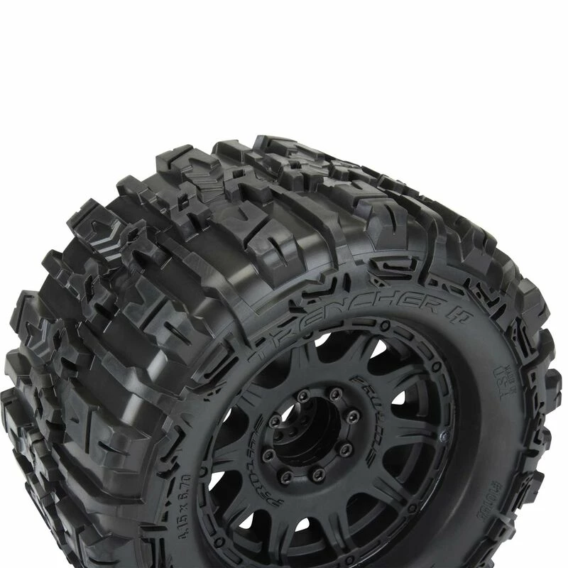 This is a pair of pre-mounted Trencher HP 3.8″ Belted All Terrain Tires. Pro-Line is proud to introduce the History-making Trencher HP 3.8″ BELTED All Terrain Truck Tires! Pro-Line has developed the technology to mold a High-Performance herringbone weave pattern Belt inside of the relentless, tall and grippy tread of the Trencher HP. These are not your average belted tires! Made for All Terrain bashing, the Trencher HP 3.8″ tires will not balloon or expand during use and will still provide the incredible grip that you expect from Pro-Line tires due to the soft M2 compound. Just like all Pro-Line’s tires, they are proudly Made in the USA! Like the original Trencher X 3.8″ tire, the next generation Trencher HP 3.8″ is destined to become the ultimate, go-to Bash tire for your truck!