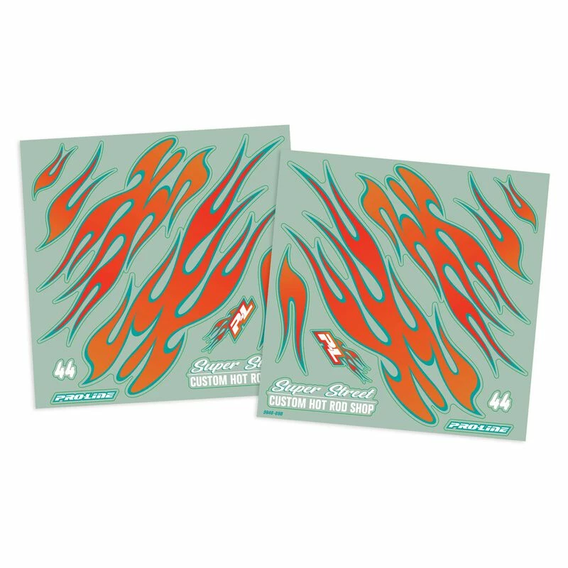 This is a Pro-Line Hot Rod Shop Universal Graphics Kit. Do you want to transform the look of your RTR body, Pro-Line tough color body, or even your custom painted body? Look no further than Pro-Line’s new Hot Rod Shop Universal Graphics kit! This sticker kit fits most 1:10 and 1:8 bodies on the market and features Hot Rod style flames in various sizes to make your car or truck stand out from the rest. It even includes small P-L logos in the flame Hot Rod style to complete the look! All the stickers included with this graphics kit are pre-cut and they are thicker than normal making them tougher and easier to install than your average decals. Add some Hot Rod flames to your ride with Pro-Line’s new Hot Rod Shop Universal Graphics Kit!