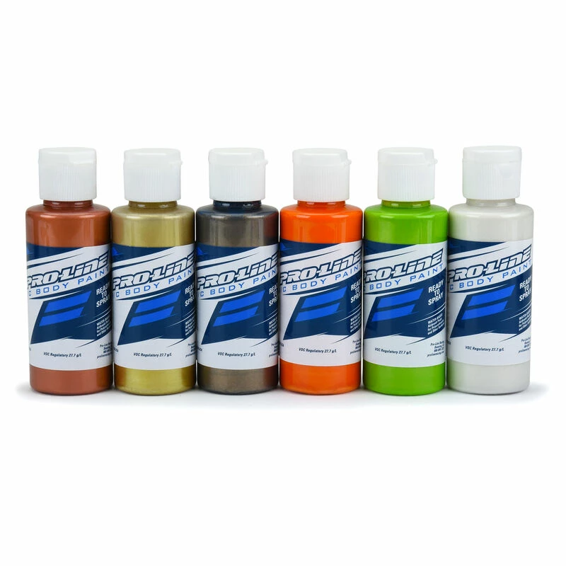 This is the all new Pro-Line RC Body Paint – Metallic/Pearl Color Set (6 Pack) – Metallic Copper, Metallic Gold, Metallic Pewter, Pearl Orange, Pearl Lime Green, Pearl White specially formulated for Polycarbonate. Pro-Line’s Team of Innovators have painted literally thousands of RC car bodies over the years and now offers ready to spray R/C Body paints specially formulated to help you achieve the same jaw dropping results we do. Developed by R/C body painters for painters, this water-based airbrush paint is ultra-flexible, extremely durable and easy to use. Have the confidence that you are spraying the best!