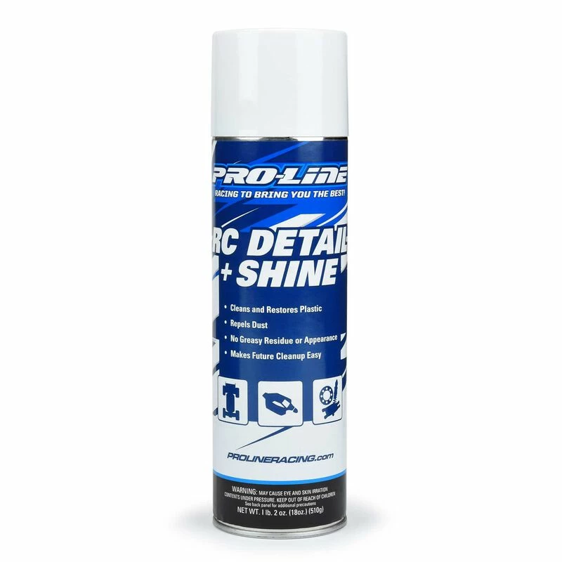 Pro-Line is proud to unleash the new standard in RC Detailing and Cleaning with the all-new RC Detail + Shine Spray! This large 18 oz. (532 ml) can is ideal for cleaning and restoring your RC Car to factory-fresh condition. Pro-Line’s unique formula repels dust and leaves a shiny, clean surface finish without the greasy residue that is often left by other cleaners. The RC Detail + Shine Spray leaves a micro-thin layer of UV protectant that moisturizes and shields your parts from future dirt and debris. This spray can be used on the entire chassis, body, and any other plastic parts for maximum shine. Use frequently between runs to keep your car looking its best!