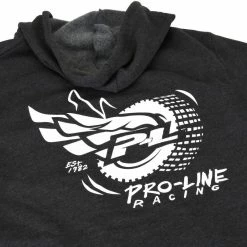 This is a Pro-Line Wings Gray Zip Up Hoodie. Introducing the new Pro-Line Wings Black T-Shirt! This ultra-soft ring spun cotton/poly blend sweatshirt features a moto-style design with winged rendition of our iconic Hole Shot tire and contrasting white zipper and drawstrings. This special logo is featured across the center of the back and a small version is on the front left chest area. Get your new Pro-Line Wings Hoodie now!